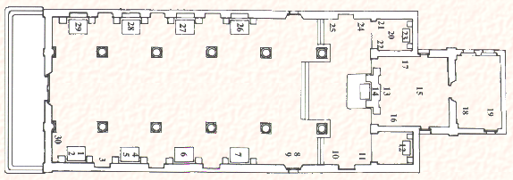 All’interno troviamo un vano rettangolare, realizzato presumibilmente all’inizio del secolo XIV, coperto da volte a crociera ribassata concluse da un sottarco impostato su semipilastri poligonali.